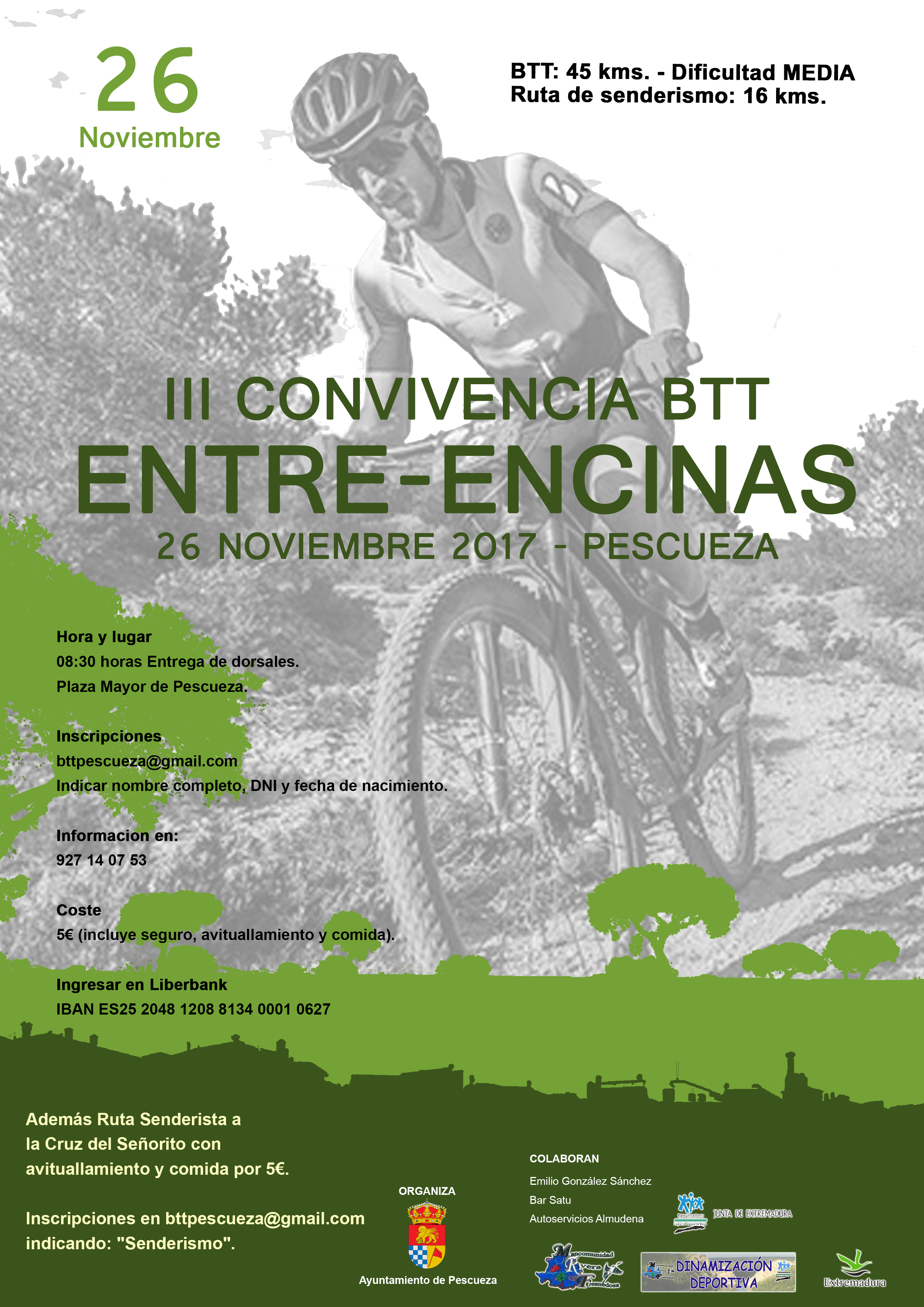 El domingo 26 de noviembre, se celebra en PESCUEZA la III CONVIVENCIA BTT ENTRE-ENCINAS, con salida desde la Plaza Mayor. Consta de la prueba BTT con 45 kilómetros y una ruta de senderismo de 16 kilómetros. Organiza el Ayuntamiento de Pescueza y colaboran Dinamización Deportiva de Mancomunidad Rivera de Fresnedosa, la Junta de Extremadura, Emilio González Sánchez, Bar Satu y Autoservicios Almudena.