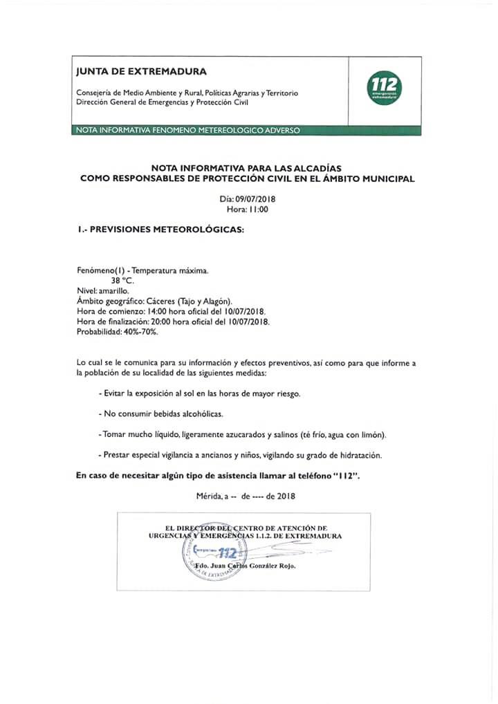 El Centro de Atención de Urgencias y Emergencias 112 de Extremadura informa sobre la alerta amarilla por altas temperaturas (38 grados), de mañana día 10 de julio, entre las 14:00 y las 20:00 horas.