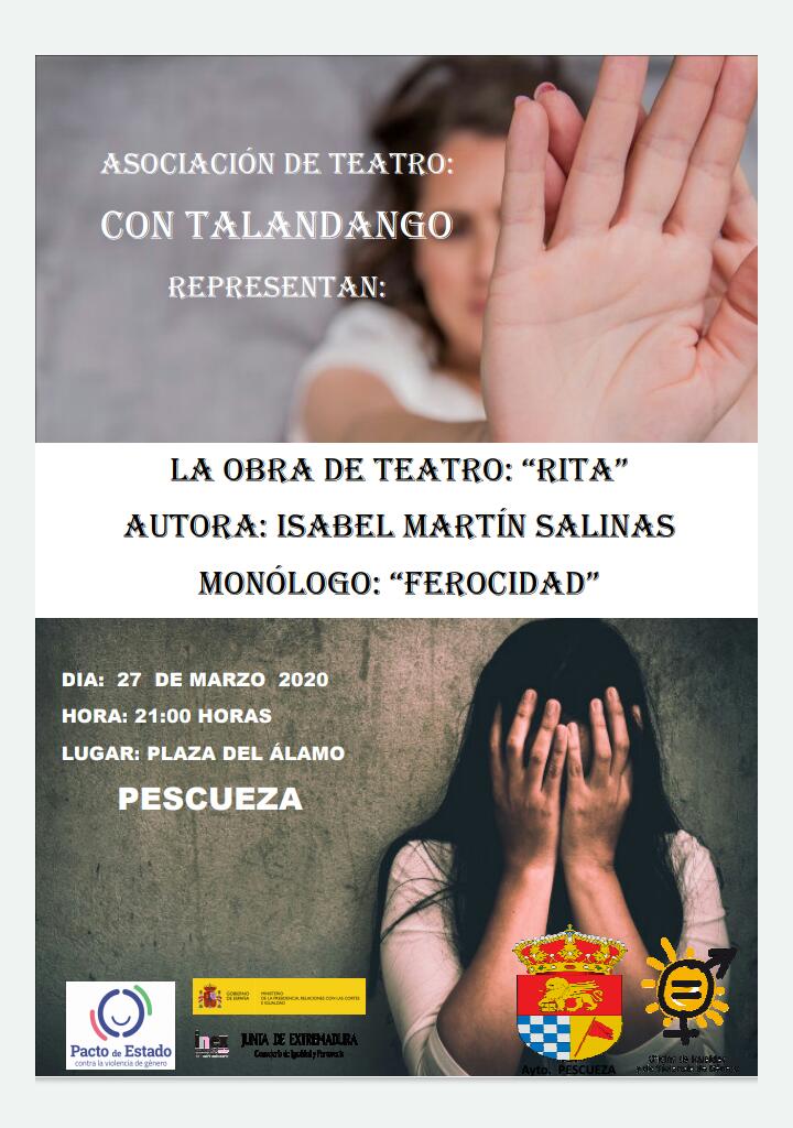 El 27 de marzo, la asociación de teatro "Con talandango" de Acehúche, va a representar en Pescueza, la obra de teatro "Rita" y el monólogo "Ferocidad", dentro de las actividades programadas para el Festivalino 2020.