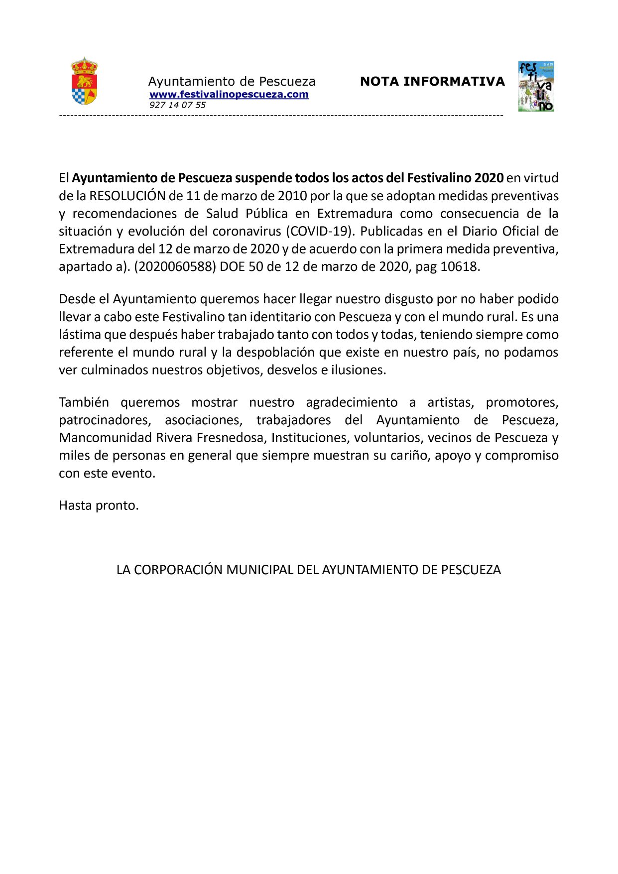 El Ayuntamiento de Pescueza informa que se suspenden todos los actos del Festivalino 2020 en virtud de la Resolución de 11 de marzo de 2010 por la que se adoptan medidas preventivas y recomendaciones de Salud Pública en Extremadura, como consecuencia de la situación y evolución del coronavirus.